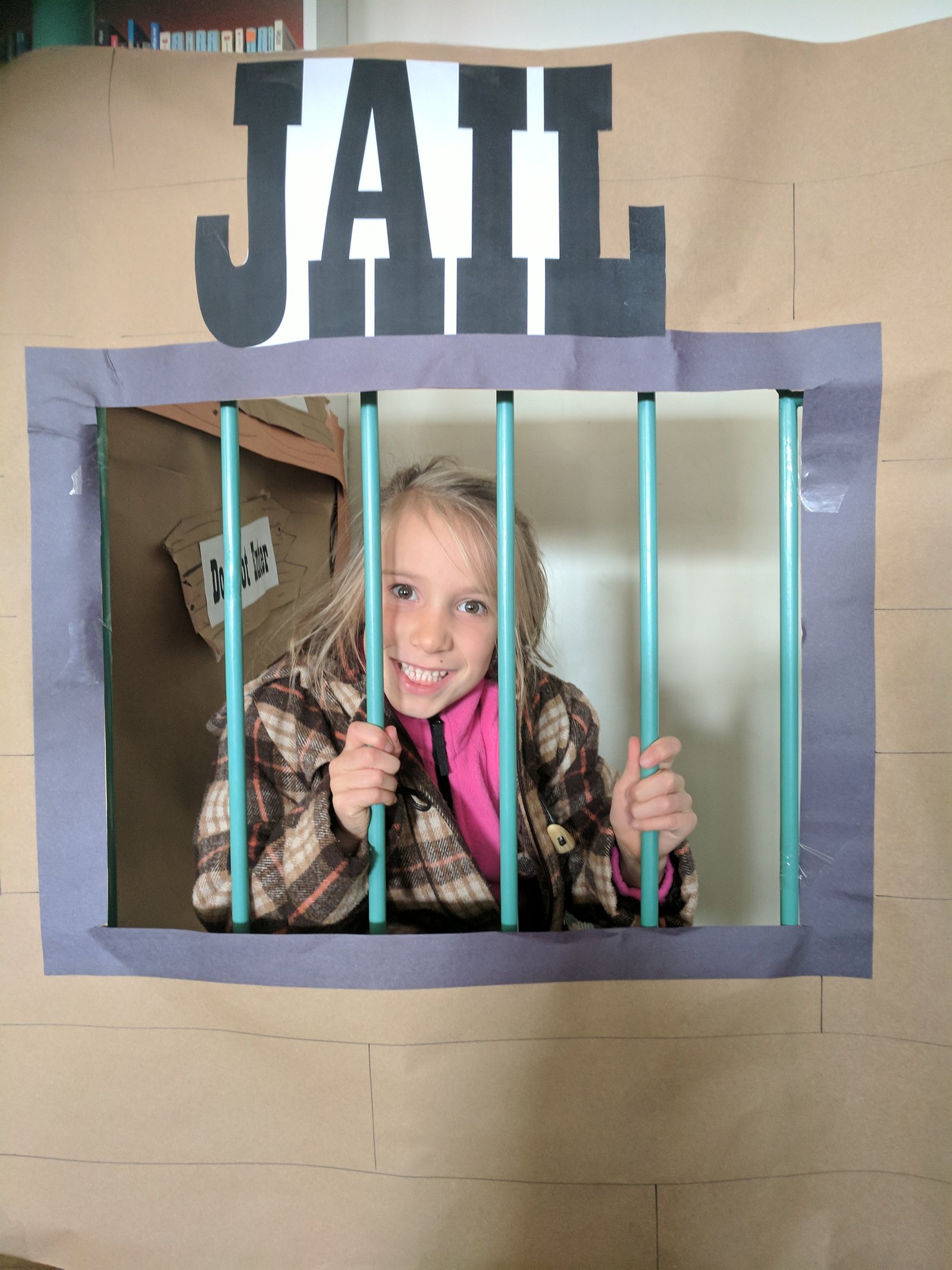 Elise Loves School! She even wanted to go on Wednesday when we were without power for 22 hours. I got to sneak out of the house all by myself to pick her up after her day of learning in the dark and we did some shopping at her school library’s book fair. She just kept smiling even when she was framed and thrown in jail.